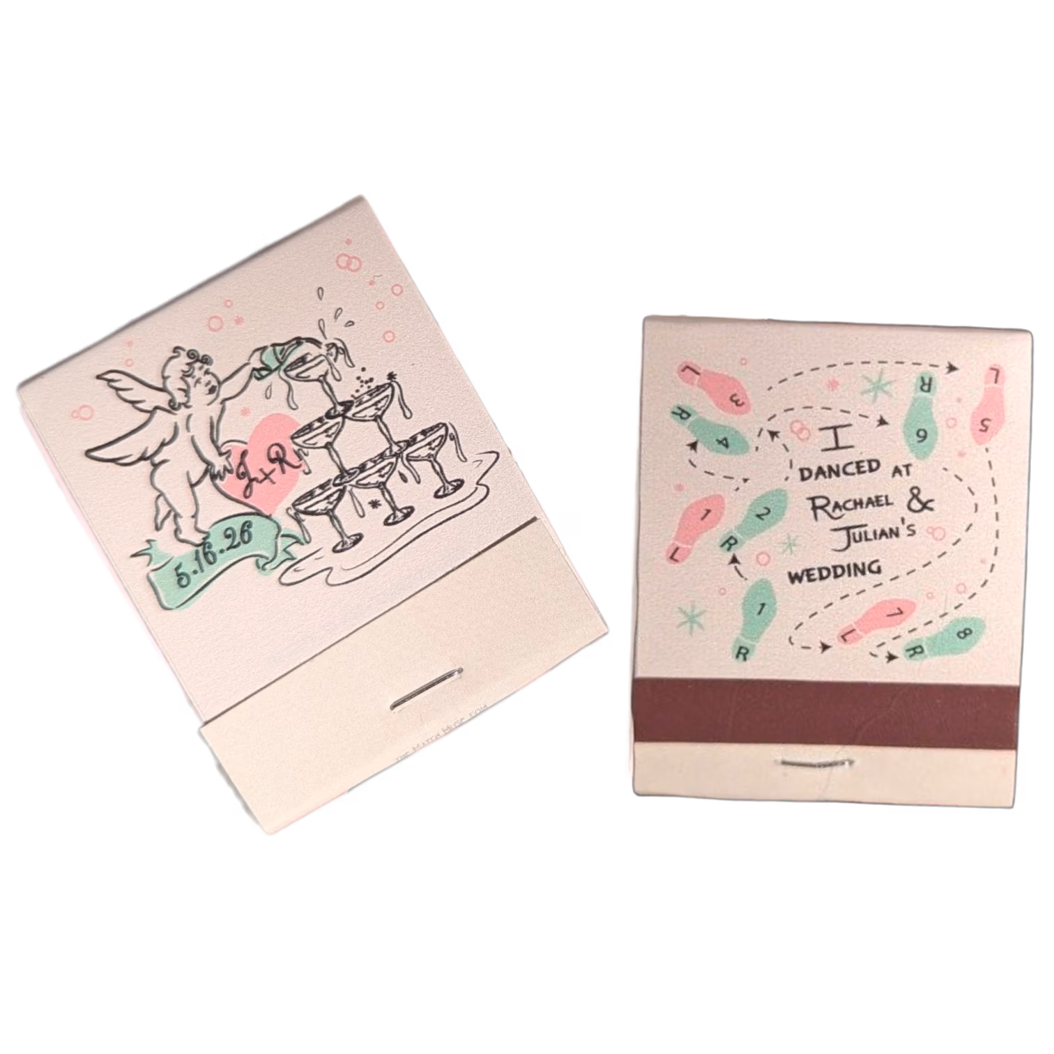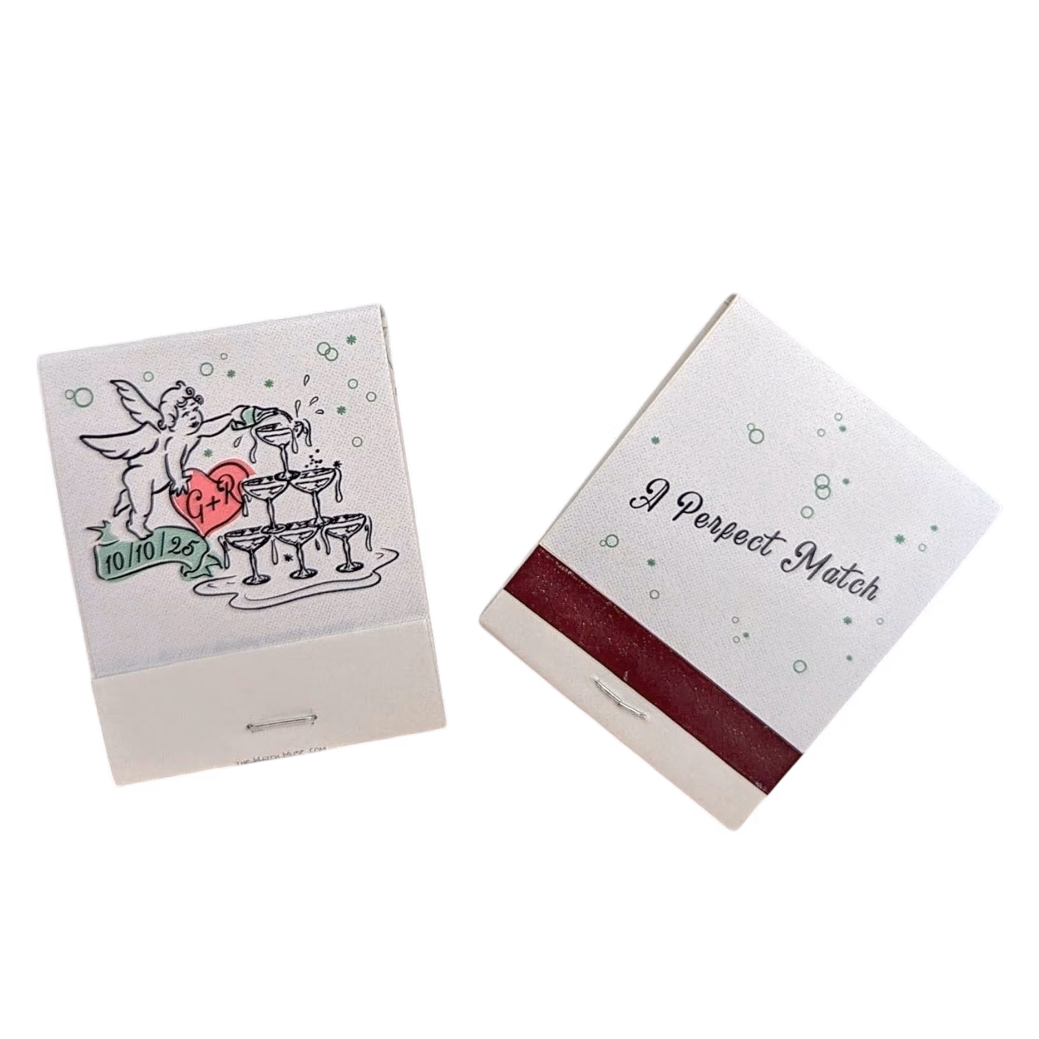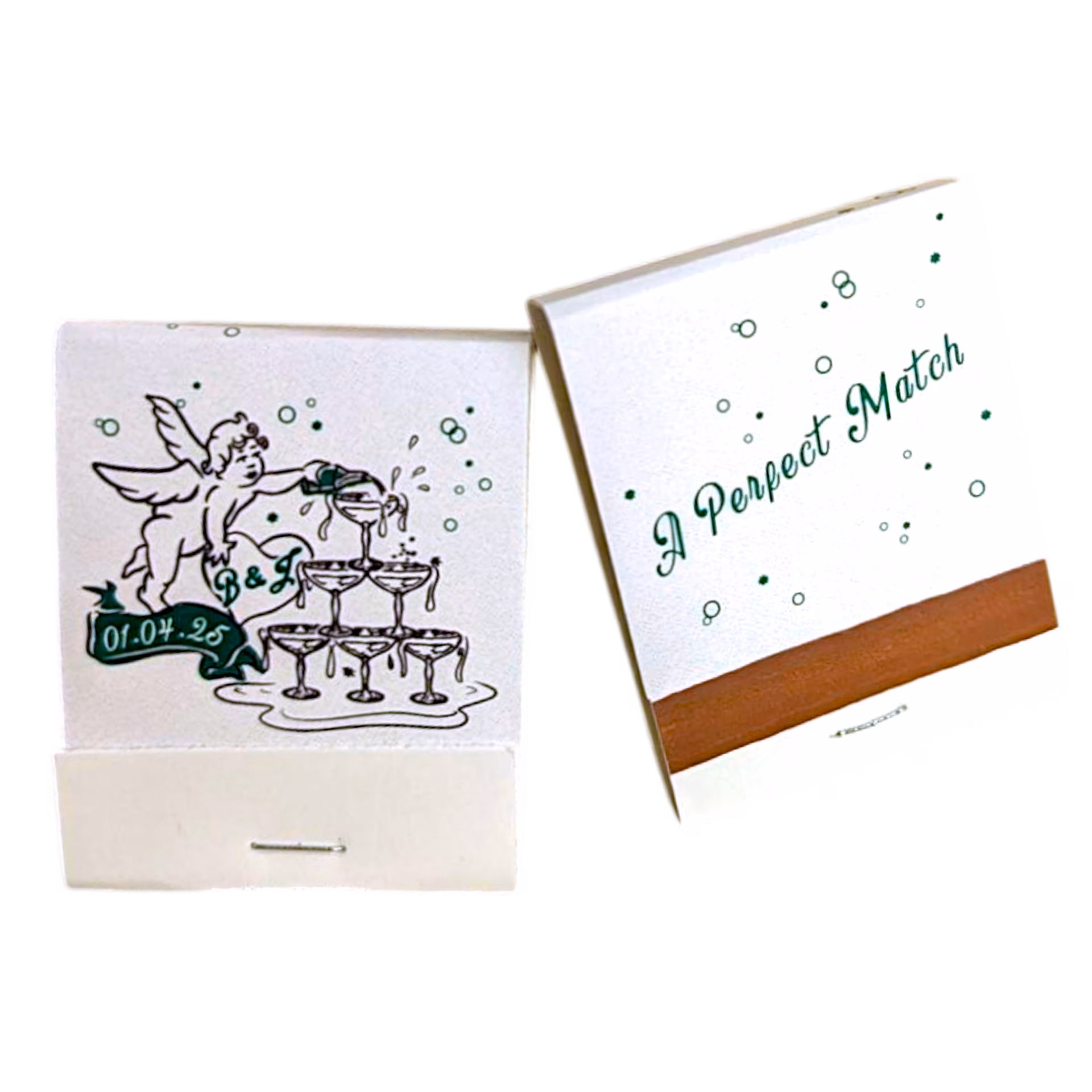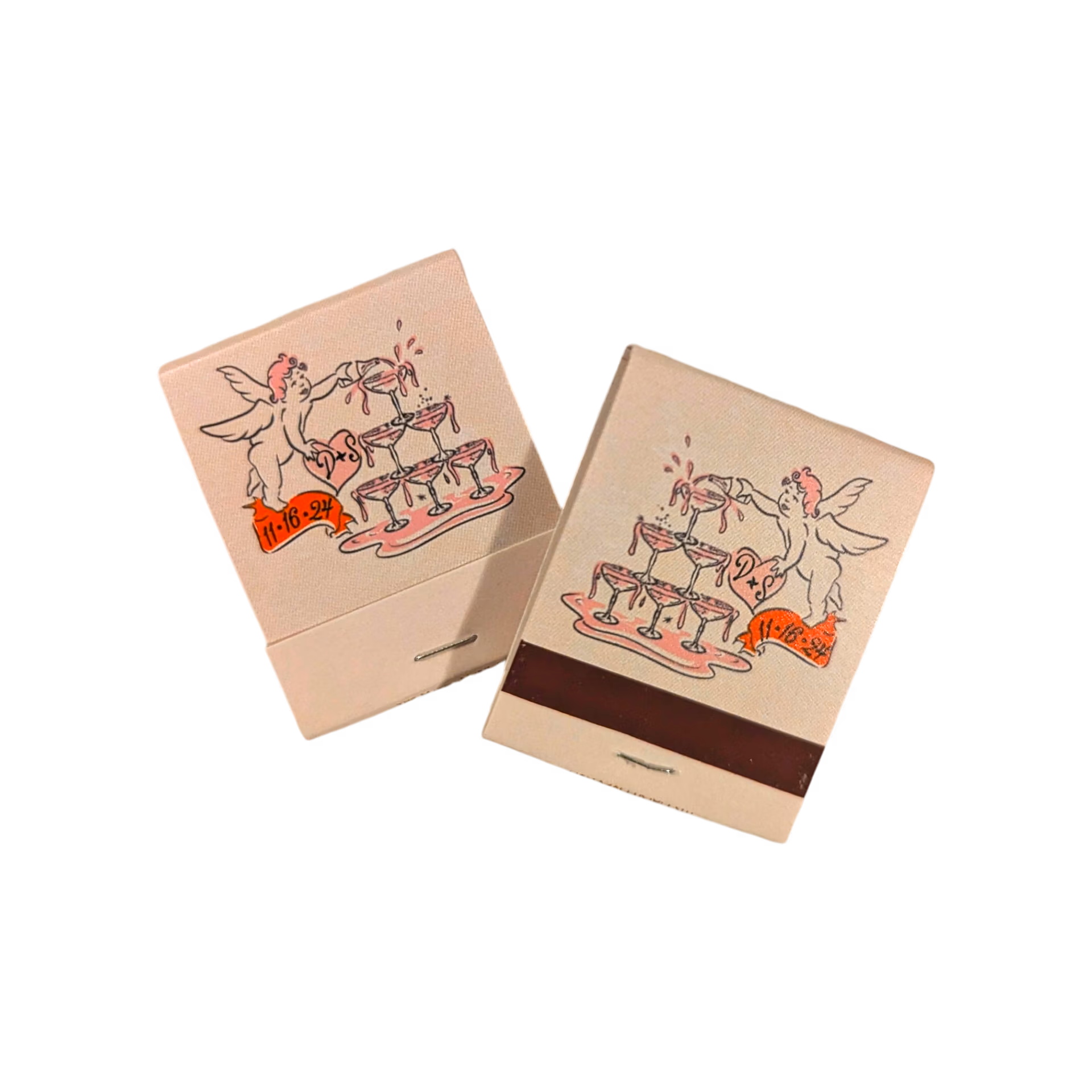He’s at it again! Pour on the charm, with everyone’s favorite mischievous lil’ buddy! Cupid’s Champagne Tower matches will get your pals tipsy . . . but they’ll have something cute, to help them remember the night before!
