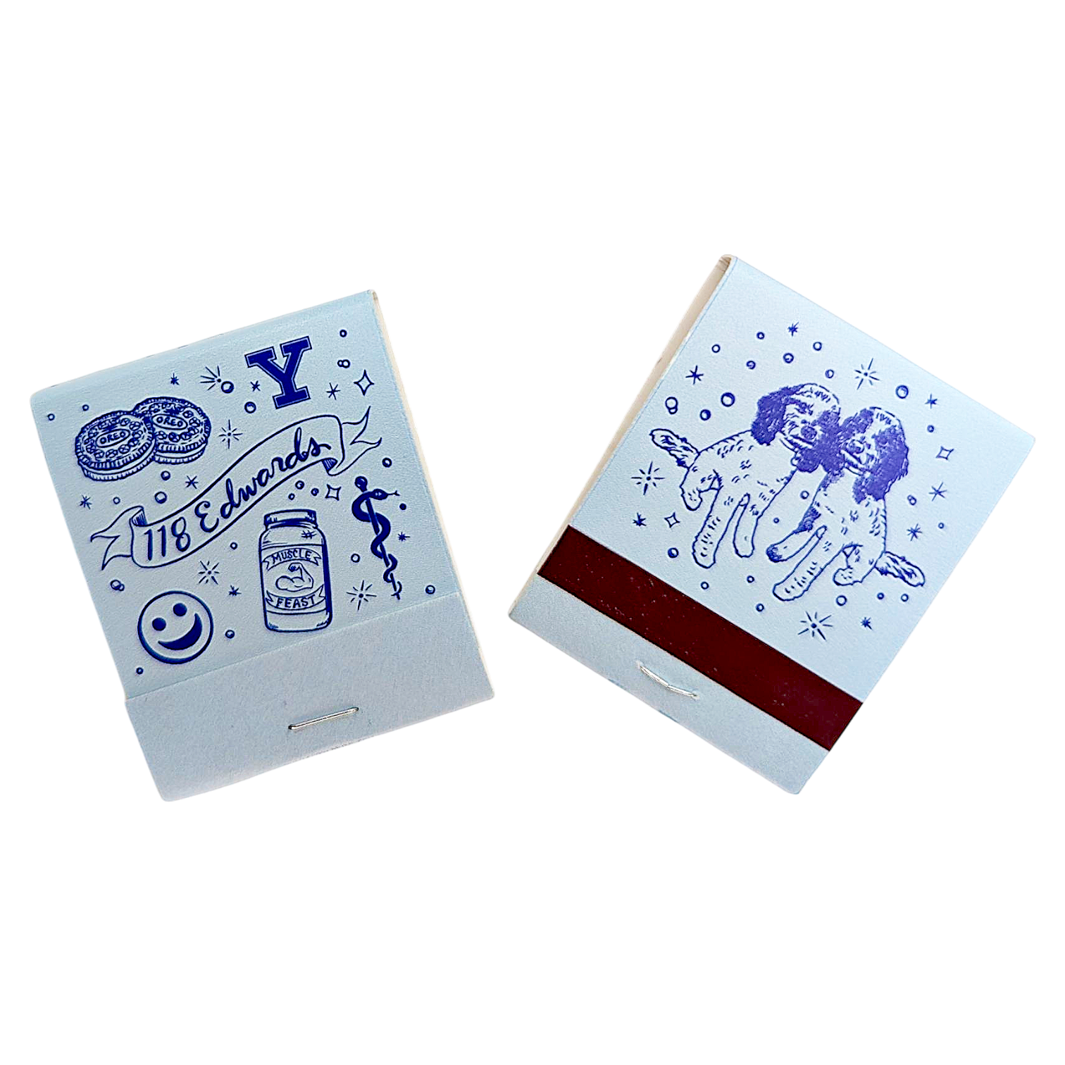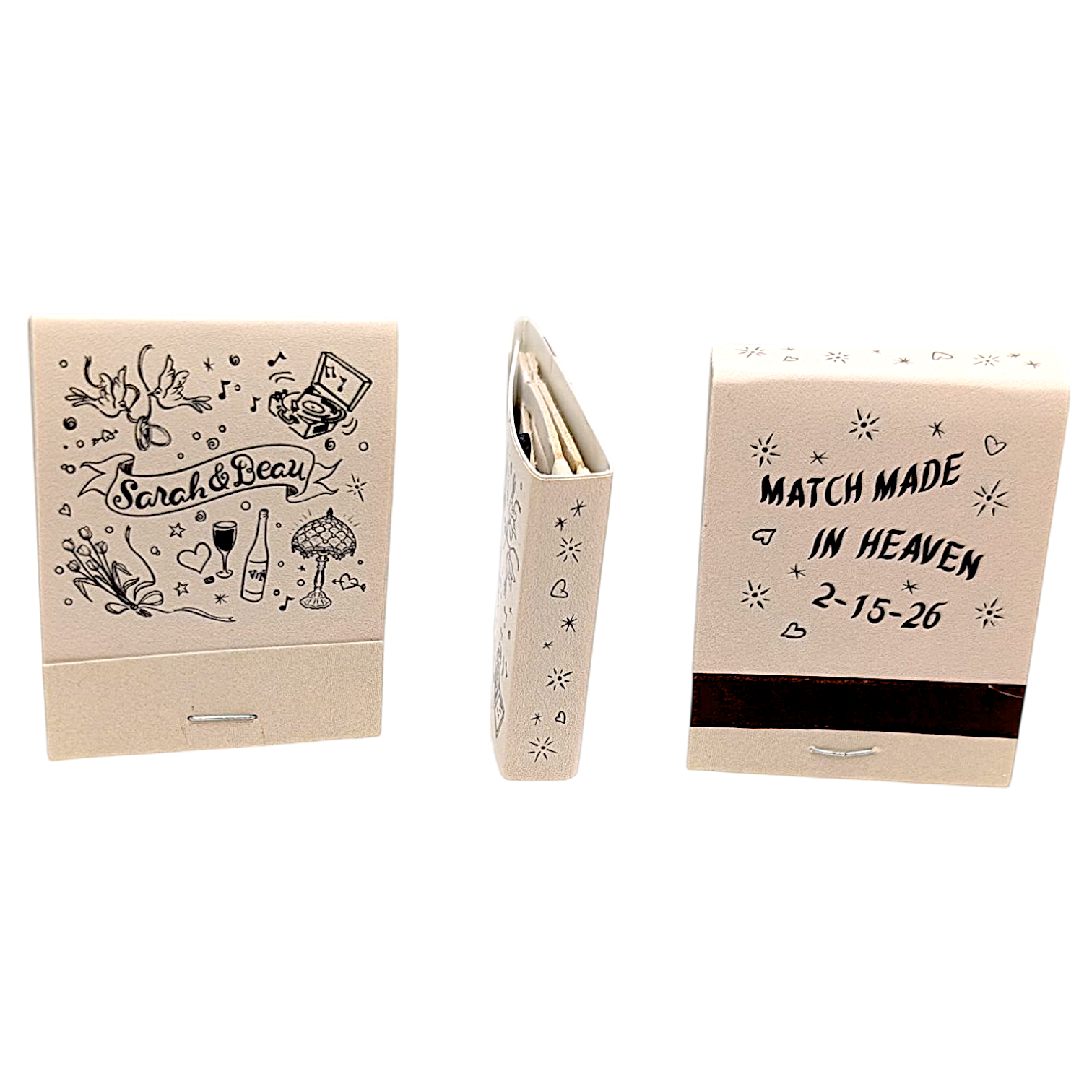 - Each matchbook is adorned with a delightful, hand-drawn illustration that’s uniquely yours. We’ll work with you to capture your favorite foods, drinks, pets, or anything that represents your special connection. Our illustrations are professional and truly one-of-a-kind, designed to perfectly complement your event.