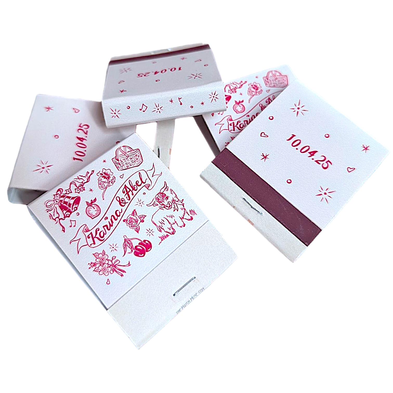 Make your event truly memorable with our “Cutie Pie” collection— hand illustrated custom matchbooks featuring adorable “tattoo style” line drawings of your fave things! From your favorite foods and fizzy drinks, to beloved pets & anything else you can imagine, these matchbooks are the perfect way to share the joy and interests you and your partner cherish with your wedding guests or party people! Browse the photos here, or check out our design catalog and get inspired! You’ll absolutely adore the personal touch and the playful vibe of our Cutie Pie Illustrated Custom Matchbooks! Whether it’s a cute illustration of your favorite pizza, a whimsical cocktail, or a lovable pet, these matchbooks reflect your unique bond. Join the 1,000+ happy customers who have ordered from us on Etsy (RIP Etsy!), and take a peek at some of our 300+ 5-star reviews. [See reviews here.] *Ivory and pink books are currently on back order until April 10th, 2025PRODUCT SPECS & NITTY GRITTY